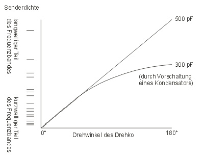 - Die Verstellung des Kapazitätsbereiches des Drehkondensators bringt nicht viel. Durch vorgeschaltete Kondensatoren geht nämlich die Linearität der Einstellkurve verloren, und besonders am Anfang, wo die Sender am dichtesten liegen, verläuft dann die Kurve sehr steil, so dass es hier praktisch keinen Unterschied macht, wie weit der Kapazitätsbereich reicht. Als ich diese Beobachtung machte, habe ich ein wenig gerechnet: