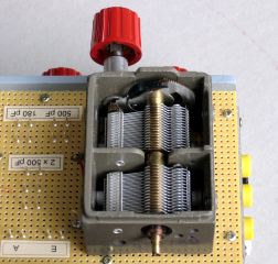 Unterhalb des Luftdrehkos liegen die Knöpfe für zwei weitere Drehkondensatoren (allerdings einfache "Quetscher"): 500 pF und 180 pF. Einer davon ist für Rückkopplungszwecke vorgesehen, der andere kann u.a. auch zur Abstimmung des Antennenkreises dienen.