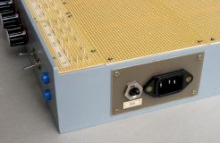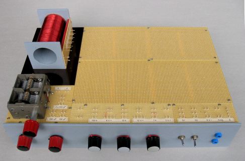 Das Gehäuse hat eine Grundfläche von 24 x 36 cm und ist 6 cm hoch. Die Lochrasterplatte oben bietet genügend Raum zur Aufnahme von Bausteinen, so dass auch umfangreichere Schaltungen realisiert werden können. Links davon befindet sich das Spulenaggregat, das nicht verschraubt ist, sondern lediglich aufgesetzt wird. Somit können die Spulen schnell ausgewechselt werden. Vorne, direkt hinter der Frontplatte, liegt eine Leiste mit verschiedenen Anschlüssen in Form von Lötstiften..