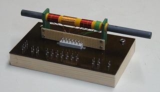 - Bei der anderen Methode wird die Wicklung auf einer Papphülse aufgebracht, und nur diese wird im Gerät befestigt. Erst anschließend wird der Ferritstab in die Hülse geschoben. Ich bevorzuge diese zweite Methode, weil man auf diese Weise mit verschiedenen Stablängen experimentieren kann. Außerdem wird nicht für jede "Probierspule" gleich ein eigener Ferritstab benötigt.