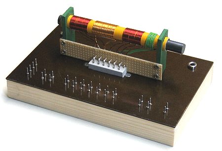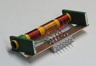 Die abgebildete Spule wurde exakt nach den Vorgaben angefertigt. In der Spule steckt ein Ferritstab von 1 x 13 cm. Ein längerer Stab (z.B. 20 cm), lässt sich ebenfalls verwenden, doch dadurch erhält die Spule eine größere Induktivität von mehr als 300 uH, was wegen der vielen Anzapfungen nicht tragisch ist, aber immerhin bedacht werden sollte.