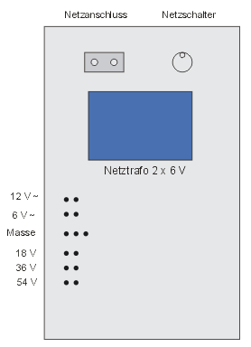 Printtrafo 2 x 6 V (insgesamt 10 W) liefert den Strom. Die
