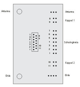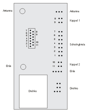 - Spulenplatte. Sie wird neben die Grundplatte gestellt und enthält entweder eine fest montierte Mittelwellenspule oder eine Mehrfachbuchse zum Aufstecken verschiedener Spulen. Es kann darauf auch ein Drehkondensator montiert werden.