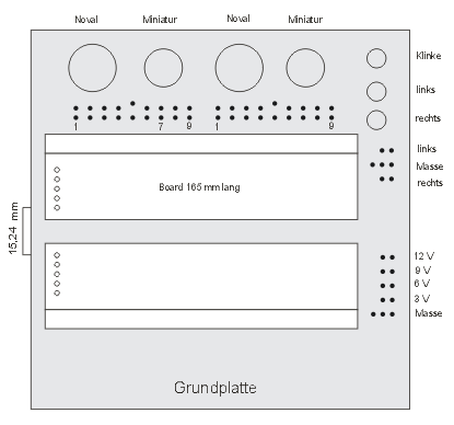 Eine genaue Beschreibung der Frontplatte erübrigt sich, denn sie kann so ähnlich gestaltet und montiert werden wie beim Mini-Experimentiergerät. Ich selber habe überhaupt keine Frontplatte angefertigt, da ich die Grund- und Spulenplatte einfach in das Radio-Schaltpult 2 einsetze.