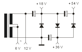 Die einfachste Möglichkeit wäre, einen Trafo von 36 V oder 48 V zu nehmen und eine Gleichrichterbrücke nebst Elko dahinterzuhängen. Der Elko würde sich auf die Spannung von rund 50 V bzw. 65 V aufladen. Doch dann müsste für die Heizung ein zweiter Trafo her. Deshalb habe ich mich mit dem Gedanken angefreundet, eine Spannungsvervielfacherschaltung einzusetzen, wie es neuerdings häufiger für derartige Versuche vorgeschlagen wird: