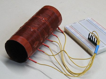 Eine schnelle und einfache Lösung, nicht ganz nach meinem Geschmack, aber durchaus vollwertig, was die Funktion betrifft. Die Spule wird einfach neben den Versuchsaufbau gelegt und mit Hilfe von angelöteten Litzen mit der Steckplatine verbunden: