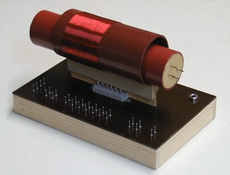 Eine wesentlich stabilere und ästhetischere Lösung besteht darin, die Spule mit einer Halterung zu versehen und fest auf einer Grundplatte zu montieren. Insbesondere die von der Spule ausgehenden Anschlussdrähte liegen nun geschützt und brechen im Betrieb nicht ab. Die Anschlüsse können mit Hilfe von Lötstiften hergestellt werden.