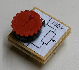 Potentiometerbaustein, aufgebaut aus einem Trimmpoti mit aufgesteckter Rändelscheibe. Kompakter geht es nicht mehr.