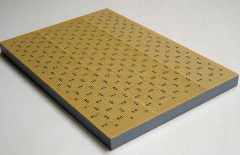Die Grundplatte basiert auf dem Kopplungsraster mit versenkten Buchsenleisten. Nicht aufgezeichnet sind die Masseverbindungen im Mittelpunkt jedes Knotens. Bausteine mit Massekontakt haben einen entsprechenden Anschlussstift, der automatisch an der richtigen Stelle eingesteckt wird, auch bei Drehung des Bausteins.