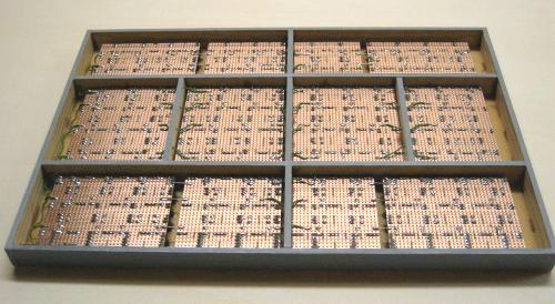 Die unteren Streifenrasterplatinen sind aufgelötet. Dadurch wird die Grundplatte verwindungssteif und stabil.
