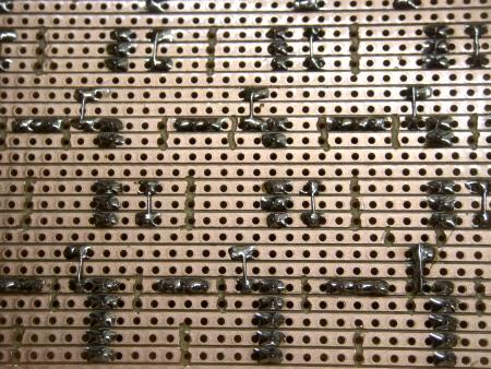 Das Bild zeigt einige Details. Wegen der ständig wechselnden Richtung der Buchsenleisten sind sehr viele Drahtbrücken und Leiterbahnunterbrechungen erforderlich.