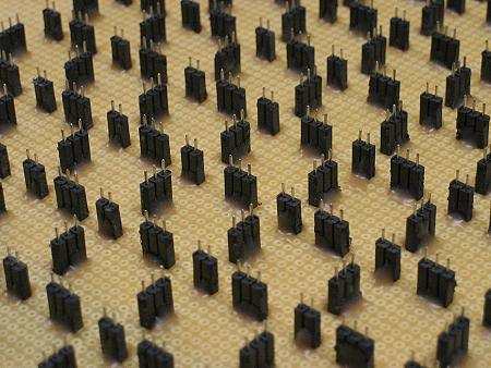 Blick auf die Unterseite: Ein kleiner Wald von aufgeklebten Buchsenleisten. Die Zweierleisten sind für die Massekontakte vorgesehen. Ein Kontakt hätte gereicht, aber dann hätte es Stabilitätsprobleme gegeben.