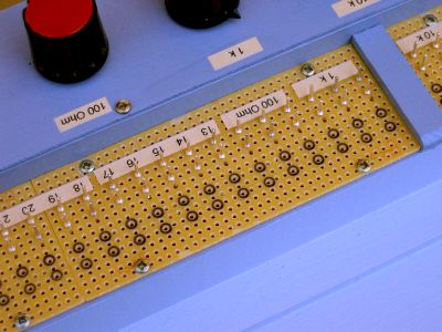 Die vordere (untere) Teil der Konsole kann wahlweise mit weiteren Komponenten bestückt werden, die sich nach Bedarf austauschen lassen. Zur Zeit sind nur 2 weitere Potenitiometer angebracht: 4,7 k und 47 k, beide logarithmisch. Verschiedene Schalter werden folgen.