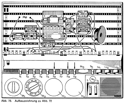 Um den Versuchsaufbau zu erleichtern und vor allem auch Experimentierenden, die Probleme mit dem Lesen von abstrakten Schaltbildern haben, zum Erfolg zu verhelfen, wird wie üblich das Schaltbild durch eine Aufbauzeichnung ergänzt. Naturgemäß sind aber "verdrahtete" Versuchsaufbauten nur schwer in übersichtlicher Form darstellbar. Sicher, man kan schon mal die Bauteile entsprechend der Vorlage aufstecken, doch das Nachvollziehen der Leitungsführung erfordert viel Aufmerksamkeit und Konzentration.