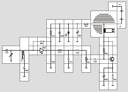 Der Kondensator von 300 pF links neben dem Anschlussbaustein für den Kopfhörer ist ursprünglich nicht vorgesehen und wurde eingefügt, um probehalber den Drehko auf über 500 pF zu spreizen. Der Drehko-Baustein ist nur für 250 pF ausgelegt, und die Spule hat eine Induktivität von etwa 200 uH. Damit kann der MW-Bereich nicht ganz erfasst werden.