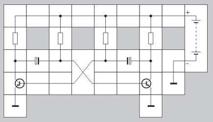 Bemerkenswert, wie sehr das Schaltbild durch die hinterlegte Graufläche an Übersichtlichkeit gewinnt. Im übrigen lässt sich da noch einiges verbessern. So könnte man die Umrisse der Elemente rot oder mittelgrau zeichnen, um die eigentlichen Leitungen besser davon abzuheben. Vielleicht wäre es noch sinnvoll, die Leitungen etwas dicker zu zeichnen.