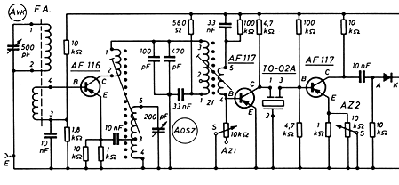 Die Funktion der Oszillator- und Mischstufe wurde auf den vorherigen Seiten hinreichend ausführlich erklärt. Die Beschreibung des Versuchs beinhaltet vor allem den Aufbau und - beim Superhet wichtig - den Abgleich der Empfangsschaltung. Man sieht, dass im ZF-Teil ein keramischer Filter anstatt einer Spule eingesetzt wird, wodurch sich die Schaltung vereinfacht.