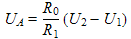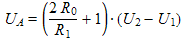 Da die Verstärkung in den nicht invertierenden Verstärkern vorgenommen wird, haben wie wieder das "Plus 1" - wir können also keine Faktoren kleiner als 1 einstellen. Und da ferner die beiden Eingangssverstärker sich den Widerstand R1 "teilen", geht der Widerstand R0 doppelt in die Gleichung ein.