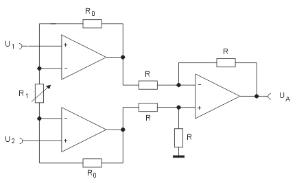 Ein paar Besonderheiten gibt es doch festzustellen. Der eigentlicher Differenzverstärker (rechts) wird mit 4 gleichen Widerständen beschaltet, das heißt, er hat den Verstärkungsfaktor 1. Die Verstärkung findet stattdessen in den beiden Impedanzwandlern statt, die nun als nicht invertierende Verstärker geschaltet sind. Das Interessante daran ist, dass es an den Minus-Eingängen einen gemeinsamen Widerstand R1 gibt. Zur Einstellung des Verstärkungsfaktors braucht nur noch dieser Widerstand angepasst zu werden; alle anderen Widerstände können fest eingebaut werden. Die Berechnungsformel ist nun ein wenig komplizierter: