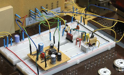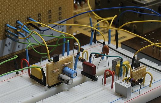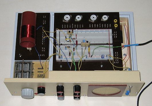 Lautsprecherempfang mit einem Verstärkerbaustein. Ansonsten handelt es sich um genau dieselbe Schaltung wie in den Bildern darüber. Die Versuchsanordnung liefert gute Zimmerlautstärke. Ich habe das Gerät mehrere Tage lang zum Radiohören verwendet.