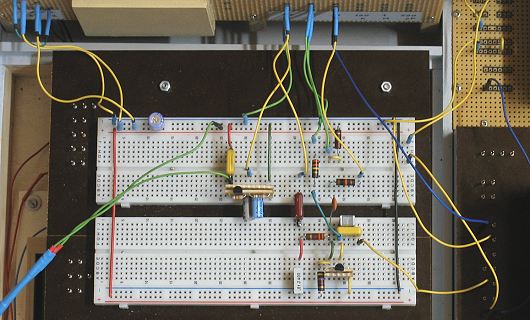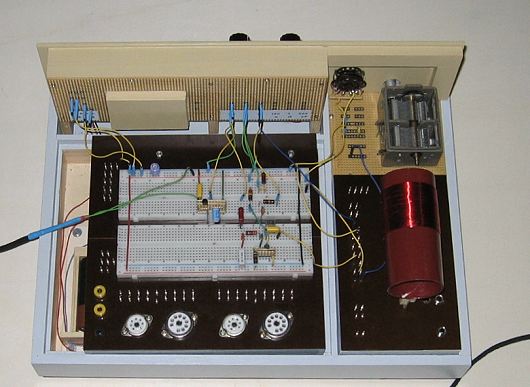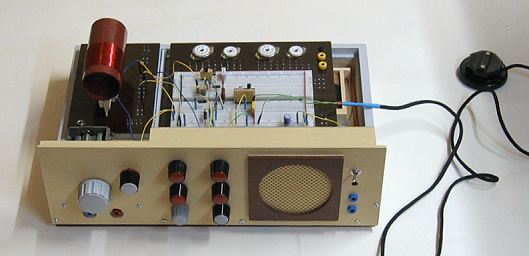 Die Bilder zeigen den Versuch zum Rückkopplungsaudion. Der Aufbau erfolgte auf den Experimentierplatten des Radio-Schaltpultes 3, die in das Gehäuse des Radio-Schaltpultes 2 hineingestellt wurden. Statt dieses Gehäuses kann genau so gut eine einfache Frontplatte verwendet werden.