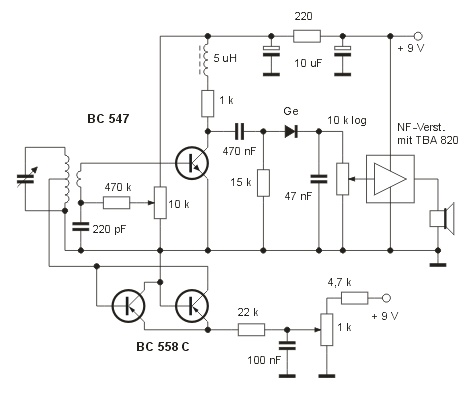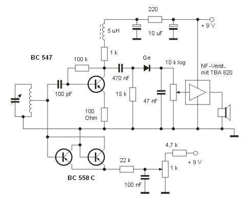 Die Schaltung zu diesem Empfänger ist bei den Experimenten zu den verschiedenen Empfängertypen entstanden. Der Empfänger erlaubt den Betrieb ohne Zusatzantenne, also nur mit der Ferritantenne, und bringt in Verbindung mit dem IC-Verstärker eine recht gute Lautsprecherwiedergabe.