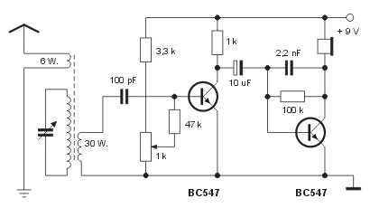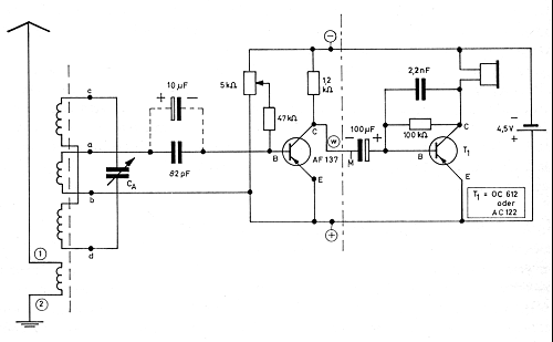 Die Schaltung ist deshalb interessant, weil sie nichts Besonderes enthält - das Audion in seiner einfachsten Form. Hier die Nachbauschaltung mit Silizium-Transistoren: