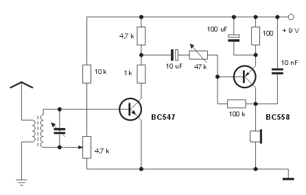 Es versteht sich, dass der Fotowiderstand durch einen Regelwiderstand ersetzt wurde. Der eingesetzte Si-Transistor fühlt sich mit einem Kollektor-Basis-Widerstand von 100 k "wohler". Schließlich wurde noch der Kondensator von 10 nF hinzugefügt, um die Schaltung schwingsicherer zu machen. Ansonsten wurden die wesentliche Schaltungsmerkmale beibehalten. Auf die Rückkopplung wurde jedoch verzichtet, einmal, weil keine Einstellmöglichkeit vorgesehen ist, zum anderen, um die Schaltung mit der des Radiomanns vergleichen zu können.
