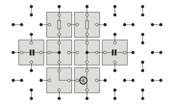 Wenn man ein Bauteil aufsteckt, bleibt an jeder Seite nur je ein Anschluss übrig, und das reicht gerade, um weitere Bauteile anzukoppeln. Damit ist auch schon das Besondere dieses Rasters beschrieben. Es handelt sich überhaupt nicht um Knoten, sondern nur um Kontakte, mit deren Hilfe zwei benachbarte Bausteine verbunden werden. Verzweigungen, das Hauptmerkmal eines Knotens, können damit nicht vorgenommen werden, sondern müssen an anderer Stelle erfolgen, nämlich in speziellen Bausteinen. Konsequenterweise geht man dann noch einen Schritt weiter und verlegt auch schlichte, unverzweigte Leitungsverläufe in die Bausteinebene. Letzten Endes werden Strippen dadurch überflüssig.