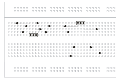 Eine übliche Steckplatine enthält nur zwei parallele Streifenraster übereinander, mit der Folge, dass eine Ausdehnung der Schaltung in vertikaler Richtung nicht oder lediglich sehr begrenzt möglich ist. Die Pfeile deuten an, dass man nur nach rechts oder links ausweichen kann. Dabei geht es so gedrängt zu, dass ganz wenig Querverbindungen direkt mit Bauteilen hergestellt werden können; der größere Teil der Bauteile kann nur über Drahtbrücken angeschlossen werden. Platz ist zwar genug vorhanden, aber die Übersichtlichkeit bricht zusammen.