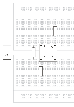 Hier geht es um die Frage, warum Schaltungen auf Steckplatinen oft sehr unübersichtlich sind. Nehmen wir als Beispiel einen Transistor. Der kann nur in ähnlicher Weise aufgesteckt werden wie in der folgenden Abbildung, wobei die Reihenfolge (E, B, C) in diesem Zusammenhang belanglos ist: