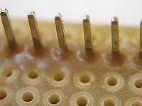 Bei vielpoligen oder großflächigen Bauteilen kann es darüber hinaus sinnvoll sein, die Löcher in der unteren Hilfsplatine auf 2,5 mm aufzubohren und von unten mit Stabilit Express anzufüllen. Dabei muss man natürlich aufpassen, dass die Stifte nicht mit dem Klebstoff verschmutzt werden. Aber nun sitzen die Stifte wirklich stabil, und auch, wenn man die Platine beim Herausziehen etwas verkantet, kann nicht mehr viel passieren.