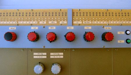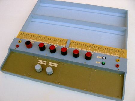 Die vordere (untere) Teil der Konsole kann wahlweise mit weiteren Komponenten bestückt werden, die sich nach Bedarf austauschen lassen. Zur Zeit sind nur 2 weitere Potenitiometer angebracht: 4,7 k und 47 k, beide logarithmisch. Verschiedene Schalter werden folgen.