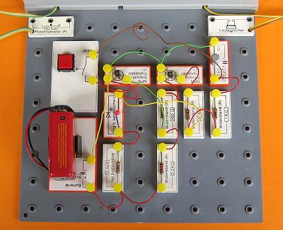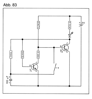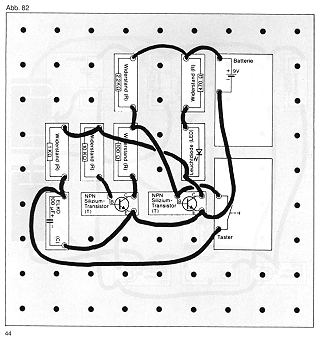 So blättere ich denn im Anleitungsbuch und suchte nach einer anderen "fragwürdigen" Schaltung. Fast alle Versuche waren so gestaltet, dass ein Blick in das Schaltbild reichte, um eine genaue Vorstellung von dem Ergebnis zu erhalten. Schief gehen konnte da auch nicht viel. Darlington-Schaltung als Durchgangsprüfer - da müssen die Tranistoren schon kaputt sein, um einen Misserfolg zu erreichen. Oder RS-Flipflop in verschiedenen Varianten. Sicher, eine ungemein nützliche Schaltung, aber links-drücken-an, rechts-drücken-aus, auch das konnte mich nicht dazu bewegen, die Schaltung auf der Buschplatte zusammenzustöpseln.