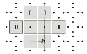 Wenn man ein Bauteil aufsteckt, bleibt an jeder Seite nur je ein Anschluss übrig, und das reicht gerade, um weitere Bauteile anzukoppeln. Damit ist auch schon das Besondere dieses Rasters beschrieben. Es handelt sich überhaupt nicht um Knoten, sondern nur um Kontakte, mit deren Hilfe zwei benachbarte Bausteine verbunden werden. Verzweigungen, das Hauptmerkmal eines Knotens, können damit nicht vorgenommen werden, sondern müssen an anderer Stelle erfolgen, nämlich in speziellen Bausteinen. Konsequenterweise geht man dann noch einen Schritt weiter und verlegt auch schlichte, unverzweigte Leitungsverläufe in die Bausteinebene. Letzten Endes werden Strippen dadurch überflüssig.
